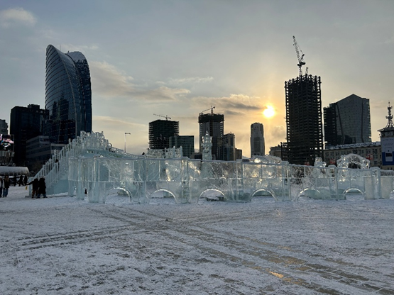 ウランバートル中心のスフバートル広場には氷の滑り台ができあがっていました